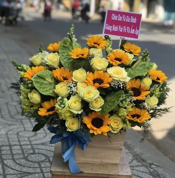 Một lẵng hoa khai trương có gam màu vàng chủ đạo là lời chúc về tiền tài, phát triển thuận lợi trong công việc làm ăn. Một số loại hoa được dùng phổ biến như hoa hướng dương, cúc, hoa hồng vàng. Nhờ sự rực rỡ của các bông hoa này đem lại, đã tăng được phần tươi tắn cho buổi khai trương.